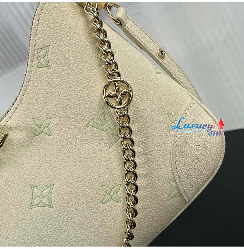 밀키 화이트 및 그린 색상의 가죽 소재. LV 플라워