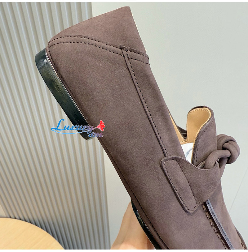 테일을 갖춘 누벅 가죽 소재의 로퍼 두 부분을 스