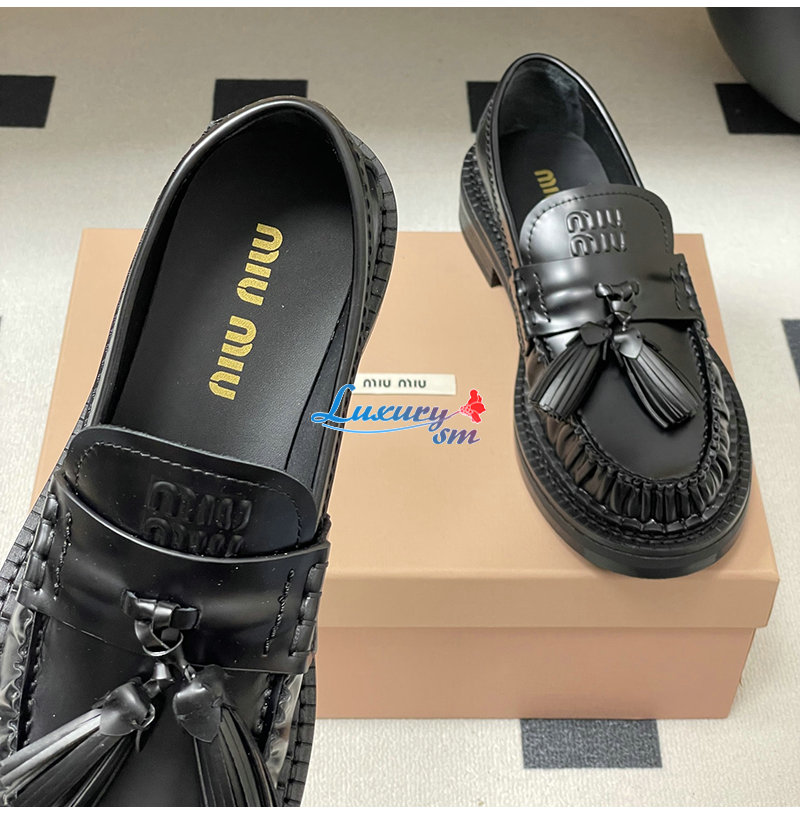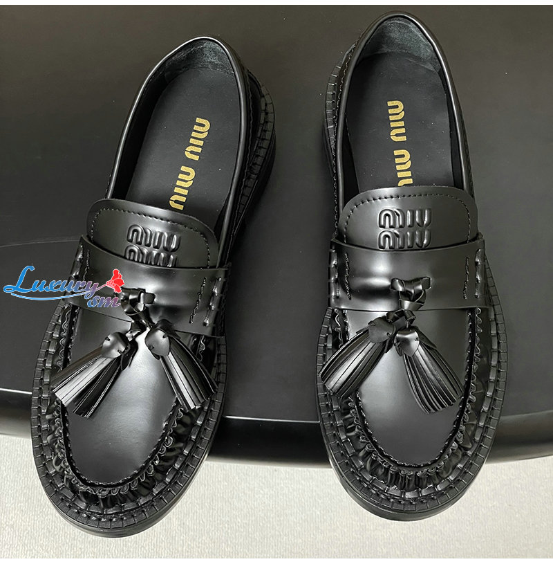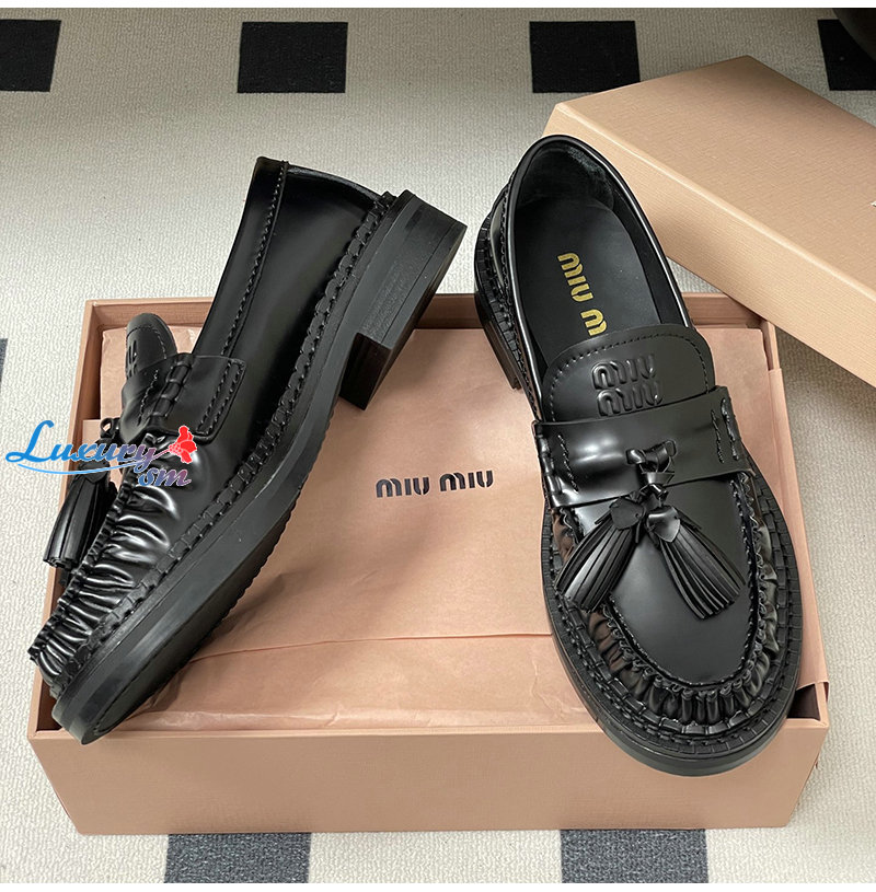 MIUMIU-5D497E 미우미우 블랙 폴리시드 가죽 테슬 로퍼